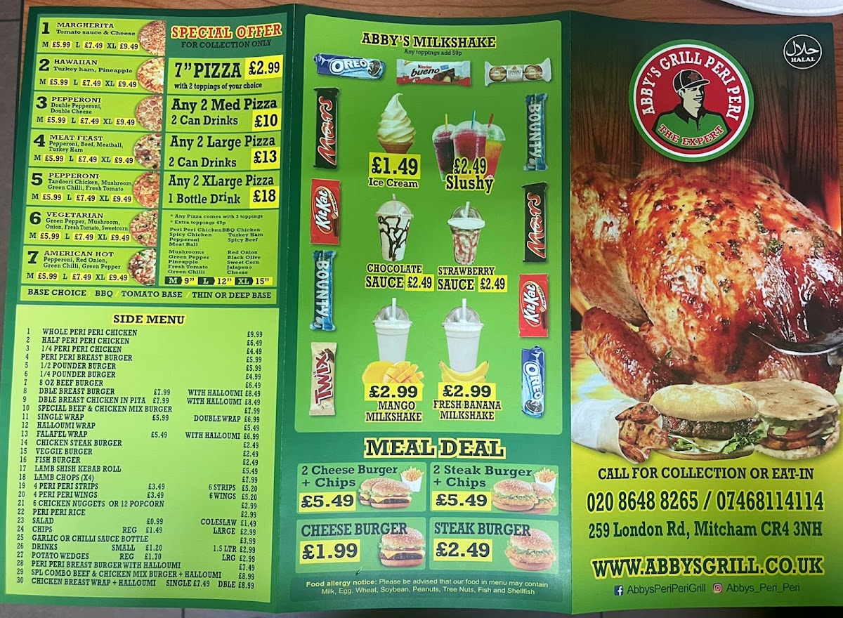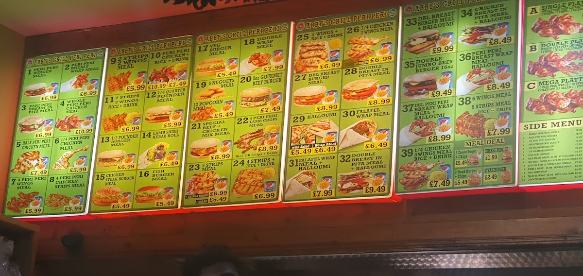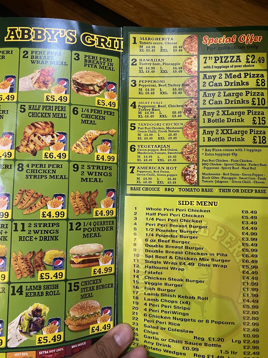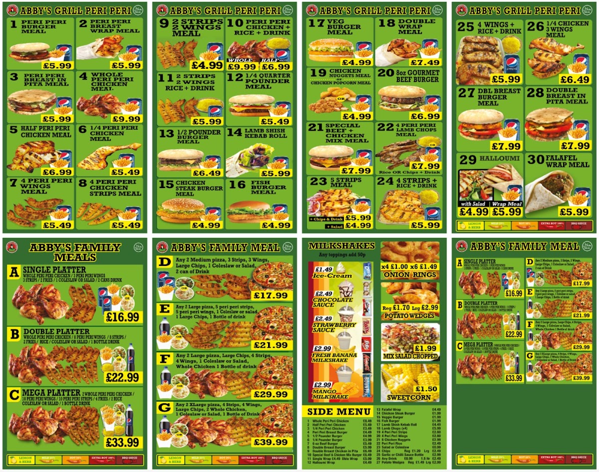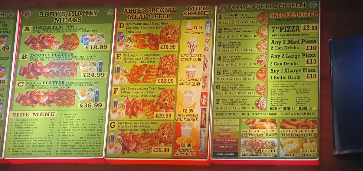 Abby's Peri Peri Grill offers a diverse menu that caters to various tastes and preferences, making it an excellent choice for both individuals and families. The Family Meals section features hearty options like Single Platter and Double Platter, with the Mega Platter for those looking for a larger feast, paired with delicious sides like Onion Rings and Potato Wedges. For meat lovers, the Whole Peri Peri Chicken or the 1/2 Pounder Burger provide satisfying main dishes, while the 8 Oz Beef Burger and 1/4 Pounder Burger offer tasty alternatives. The Meal Deals present a great value, including a combo of 2 Cheese Burger + Chips and 2 Steak Burger + Chips. For something sweet, the milkshakes are a treat, with options such as Ice-Cream, Fresh Banana Milkshake, and Mango Milkshake. Those looking for a grilled experience can enjoy the Abby’s Grill Peri Peri, offering both meat and vegetarian dishes. The Special Offers section provides fantastic deals like a 7" Pizza, Any 2 Large Pizzas with 2 Can Drinks, and Any 2 Xxlarge Pizzas with 1 Bottle Drink, perfect for sharing with friends or family. If you're craving something unique, try the Peri Peri Burger Meal, Peri Peri Whole Chicken Meal, or the delicious Peri Peri Breast Wrap Meal. Lastly, their Margherita Pizza is a must-try classic. With a range of flavorful and well-priced options, Abby’s Peri Peri Grill offers something for everyone, whether you're in the mood for a burger, pizza, or a zesty peri peri dish.