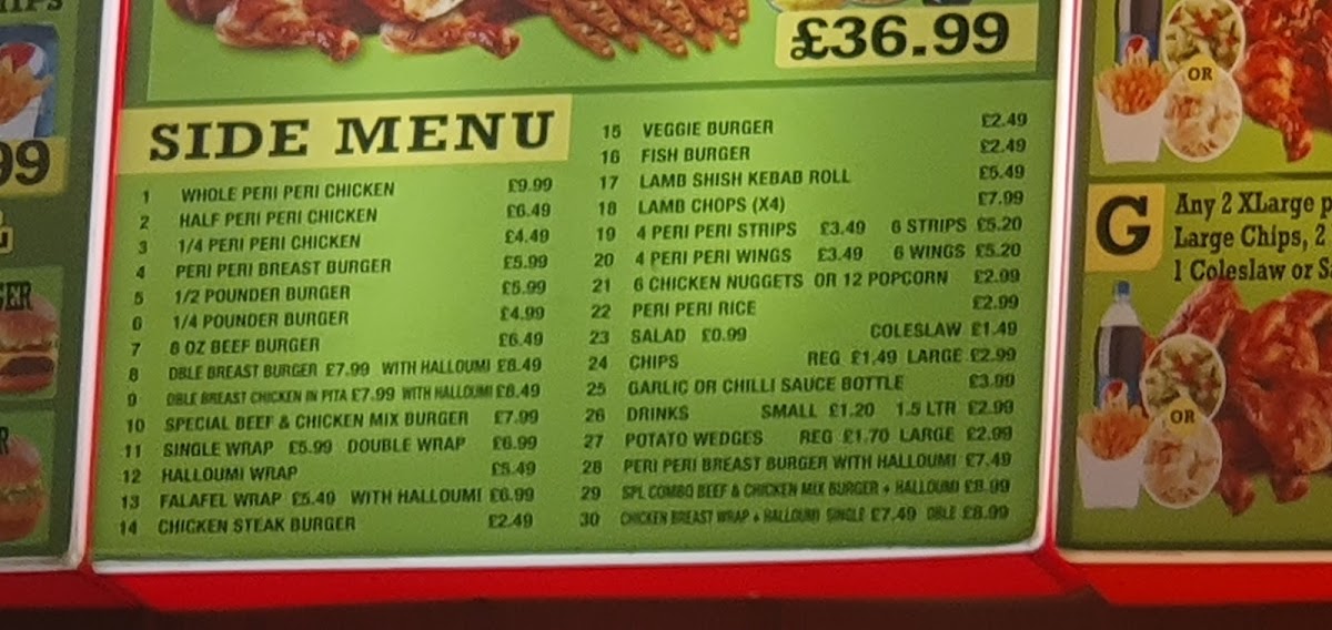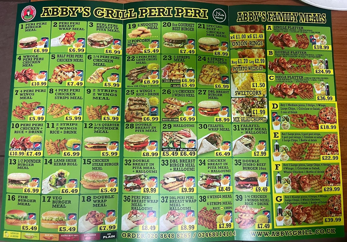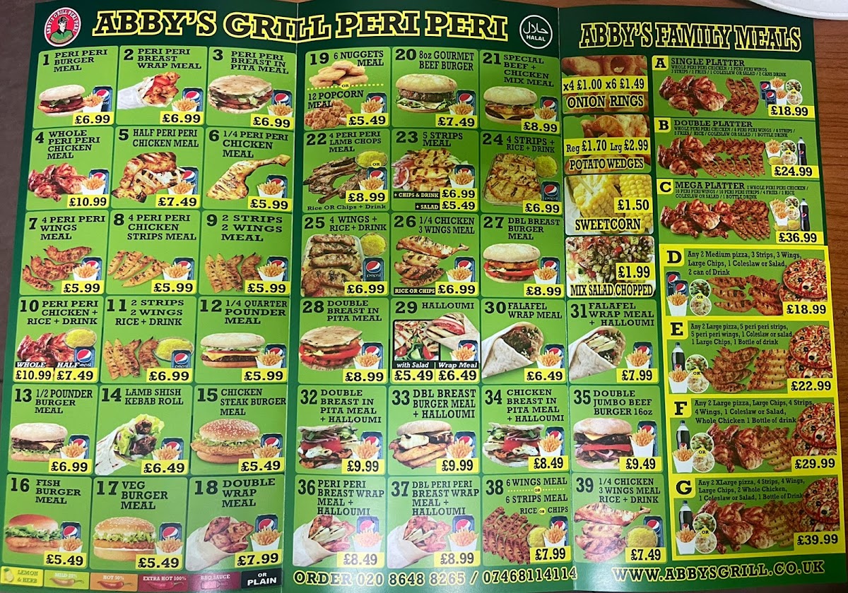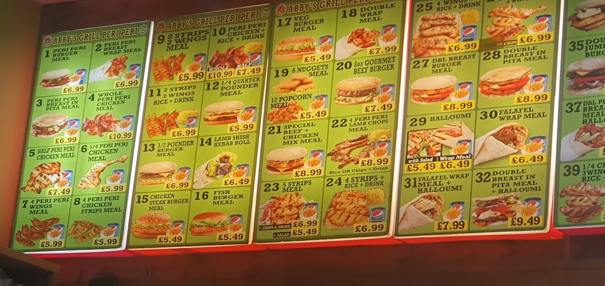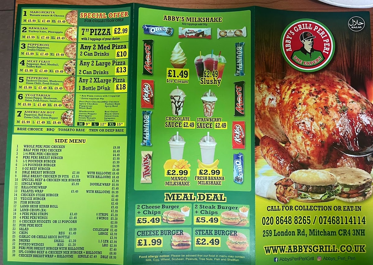 Abby's Peri Peri Grill offers a diverse menu that caters to various tastes and preferences, making it an excellent choice for both individuals and families. The Family Meals section features hearty options like Single Platter and Double Platter, with the Mega Platter for those looking for a larger feast, paired with delicious sides like Onion Rings and Potato Wedges. For meat lovers, the Whole Peri Peri Chicken or the 1/2 Pounder Burger provide satisfying main dishes, while the 8 Oz Beef Burger and 1/4 Pounder Burger offer tasty alternatives. The Meal Deals present a great value, including a combo of 2 Cheese Burger + Chips and 2 Steak Burger + Chips. For something sweet, the milkshakes are a treat, with options such as Ice-Cream, Fresh Banana Milkshake, and Mango Milkshake. Those looking for a grilled experience can enjoy the Abby’s Grill Peri Peri, offering both meat and vegetarian dishes. The Special Offers section provides fantastic deals like a 7" Pizza, Any 2 Large Pizzas with 2 Can Drinks, and Any 2 Xxlarge Pizzas with 1 Bottle Drink, perfect for sharing with friends or family. If you're craving something unique, try the Peri Peri Burger Meal, Peri Peri Whole Chicken Meal, or the delicious Peri Peri Breast Wrap Meal. Lastly, their Margherita Pizza is a must-try classic. With a range of flavorful and well-priced options, Abby’s Peri Peri Grill offers something for everyone, whether you're in the mood for a burger, pizza, or a zesty peri peri dish.